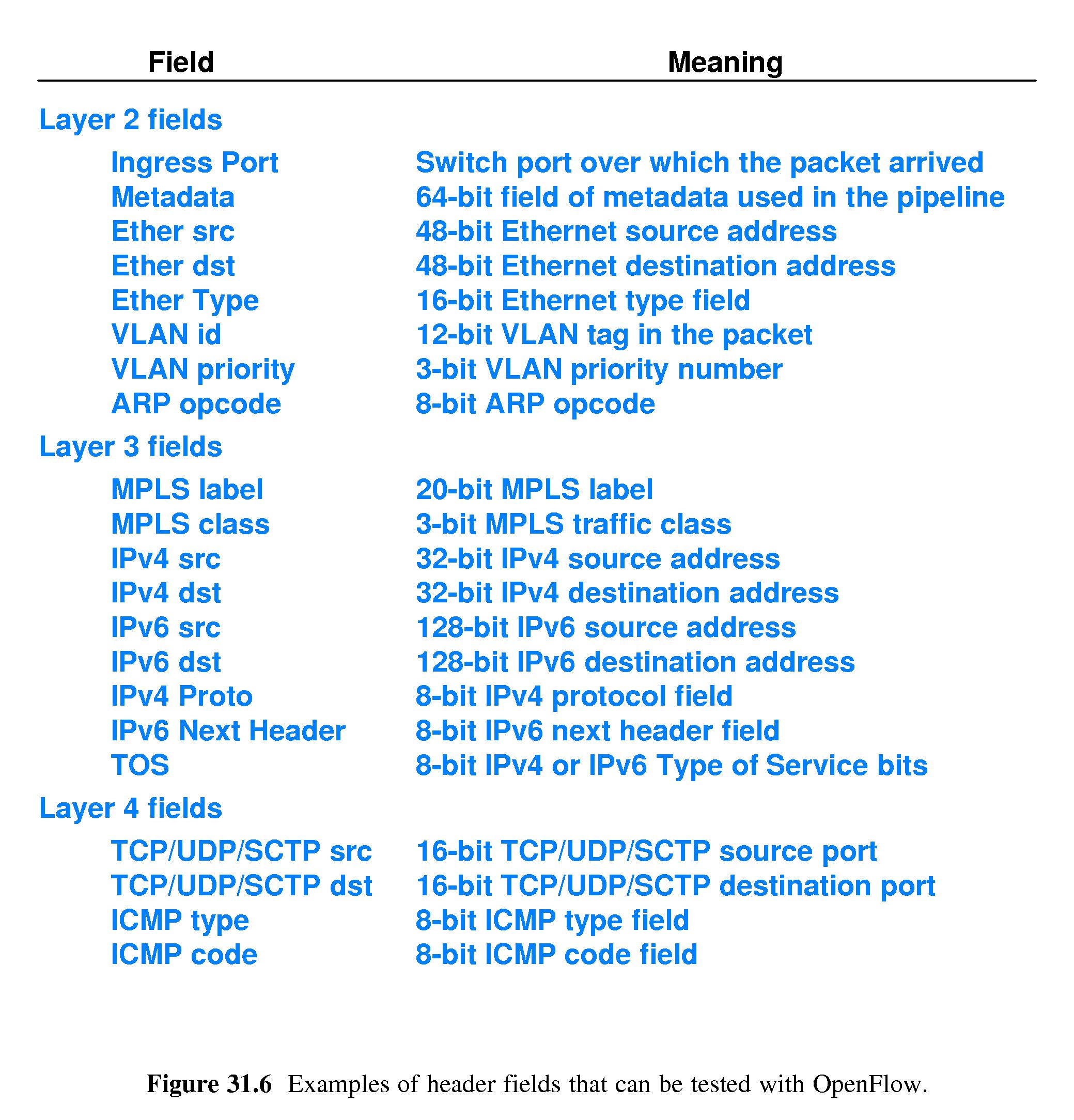 - Figure 31.6 shows the header fields that OpenFlow can use in classification patterns.