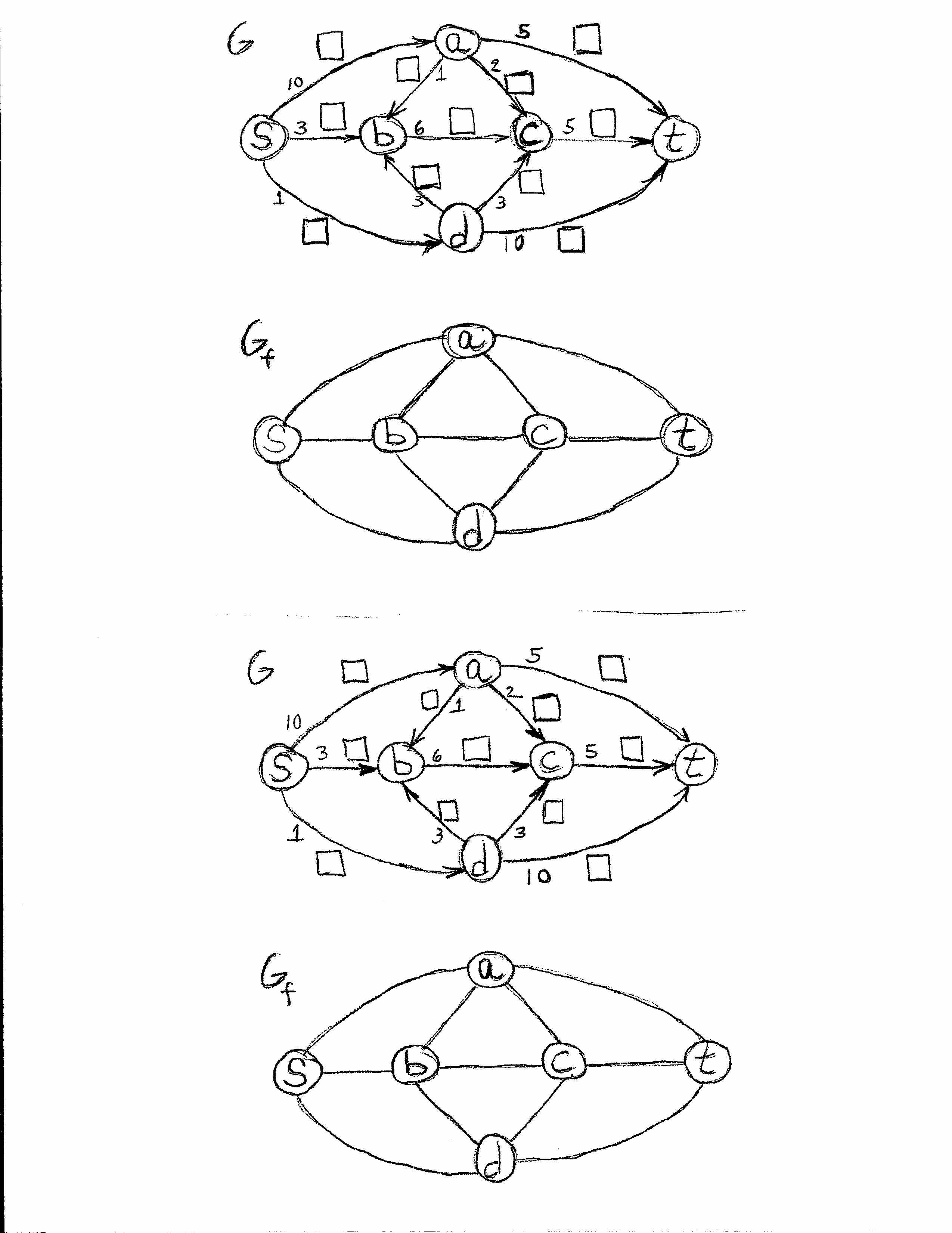 As you go along, write the flows for each edge in the little squares. When you reach the end of the algorithm, shade in the nodes that are on the "A side" of the minimum cut.
