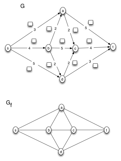 In the diagrams, edges are labeled with capacities, and flows on edges are depicted as numbers written in squares. In the first diagram we start with the flow network G with all the squares containing zero, representing the zero flow. In the second diagram, we create the residual graph, Gf, corresponding to the flow in the previous diagram of G.
